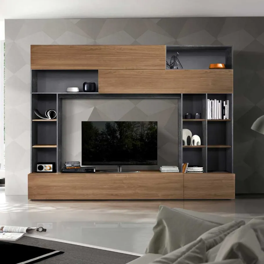 - Effektvolle Wohnwand in Dunkelgrau und Nussbaum hell