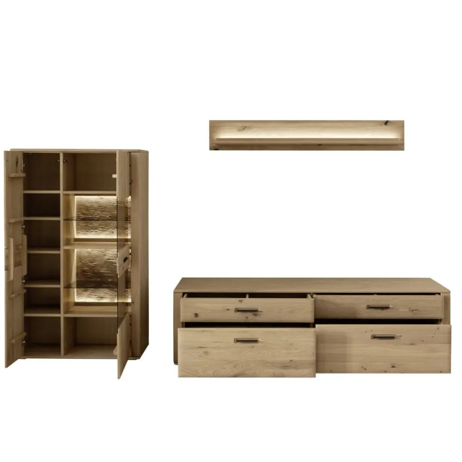 Wenn Sie die Kombination aus natürlicher Holzästhetik, hochwertiger Verarbeitung und moderner Funktionalität schätzen, werden Sie das TV-Anbauwand Möbelset „Jevedaz“ lieben. In hellem Asteiche-Finish strahlt das dreiteilige Ensemble Wärme und Wohnlichkeit aus – perfekt, um dem Wohnzimmer eine behagliche, dabei stilvolle Atmosphäre zu verleihen. Das fein abgestimmte Zusammenspiel aus Massivholz und hochwertigen furnierten Flächen unterstreicht den modernen Charakter dieser Möbel, während die edle LED-Beleuchtung die Möbelkomposition in ein stimmungsvolles Licht taucht.