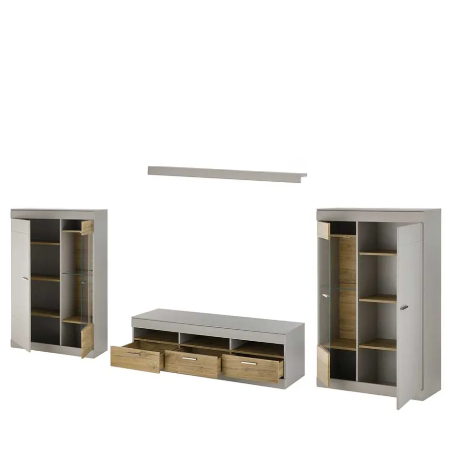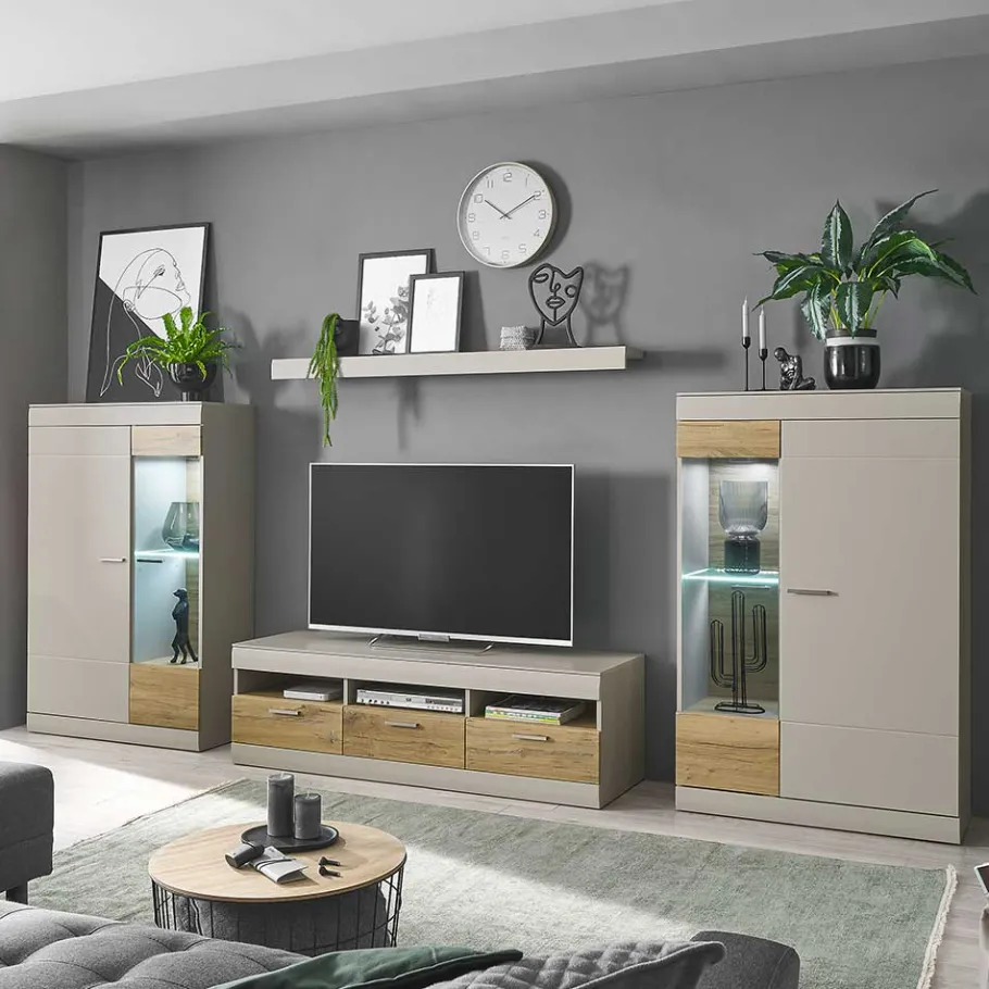 Setzen Sie ein Statement in Ihrem Wohnbereich mit unserer Wohnwand „Lioscas“. Dieses Ensemble verbindet zeitloses, modernes Design mit der Perfektion und Funktionalität, die Sie erwarten. Bestehend aus einem eleganten TV-Board, zwei stilvollen Vitrinen und einem formschönen Wandboard, schafft „Lioscas“ ein stimmungsvolles Ambiente und bietet gleichzeitig reichlich Stauraum für Ihre Unterhaltungselektronik, Bücher, Dekoartikel und vieles mehr.