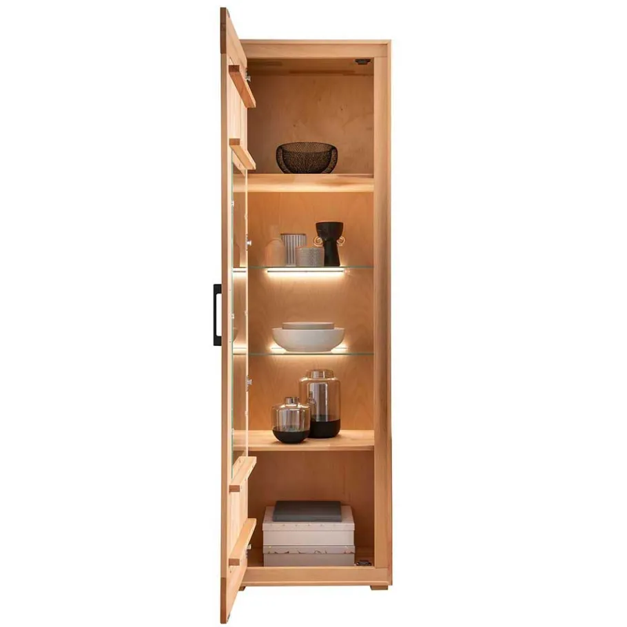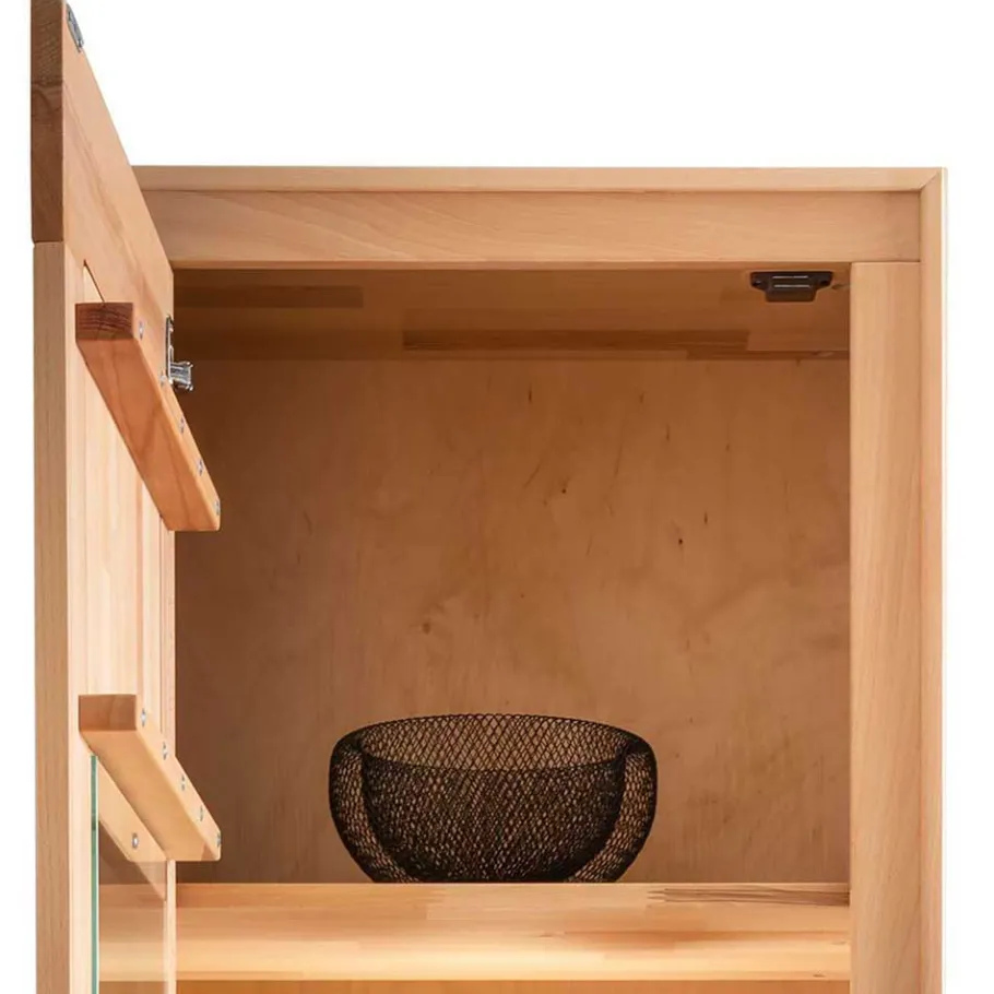 Die Wohnwand „Sarosca“ besteht aus einem Highboard, einem TV-Board, einer Vitrine und einem Wandboard. Sie ist nicht nur optisch ansprechend, sondern auch von hoher Qualität dank der Herstellung aus massivem Kernbuchenholz. Das verwendete Kernbuchenholz ist bekannt für seine Stabilität und seinen warmen Farbton. Mit seinen durchgehenden Lamellen in Deckplatten und Fronten sowie keilverzinkten Seiten und Innenausstattung bietet es eine beeindruckende Langlebigkeit und Ausdruckskraft. Es verleiht dem Möbelstück nicht nur Charakter, sondern auch eine einzigartige Ausstrahlung.Die natürlichen geölten Oberflächen unterstreichen die natürliche Schönheit des Holzes und bieten gleichzeitig Schutz. Diese Behandlung erhält die Atmungsaktivität des Holzes, unterstützt seine Fähigkeit, das Raumklima zu regulieren, und verleiht ihm eine angenehm glatte Oberfläche.