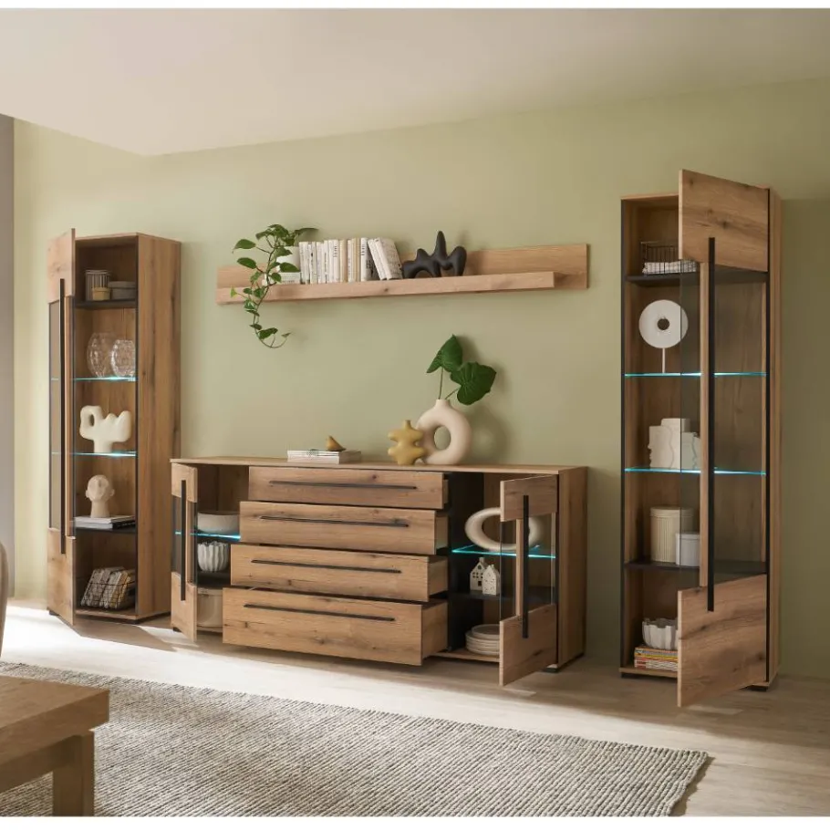 Wohnen gewinnt an Charakter, wenn ein Möbelstück nicht nur funktional, sondern auch ein Statement für Stil ist. Die Anbauwand Brocus verwandelt jedes Wohnzimmer in eine Oase der Ästhetik und des Komforts. Mit ihrem modernen Design und der harmonischen Kombination aus warmem Eiche-Dekor und eleganten schwarzen Griffleisten zieht sie alle Blicke auf sich. Das Set besteht aus einem großzügigen Vitrinen-Sideboard, einem formschönen Wandboard sowie zwei beeindruckenden Standvitrinen – perfekt aufeinander abgestimmt, um Ihrem Wohnraum Struktur und Eleganz zu verleihen.