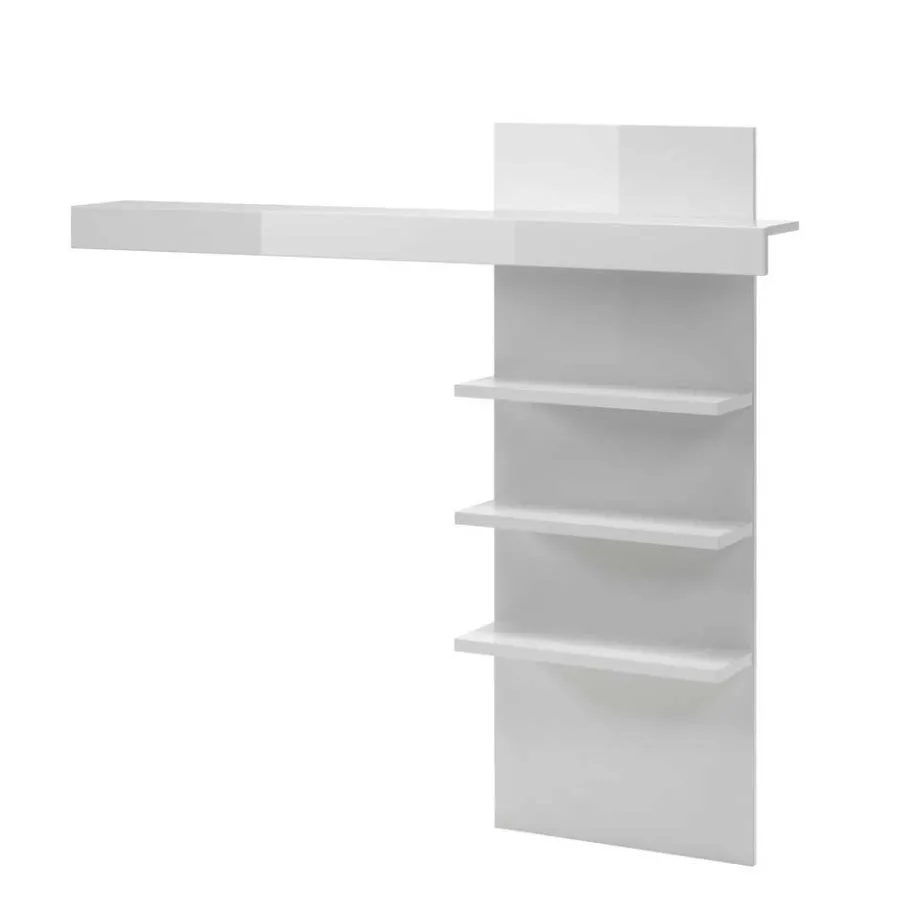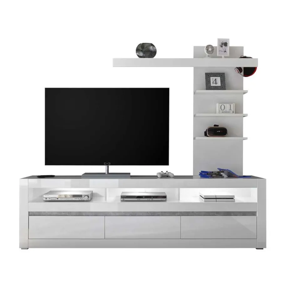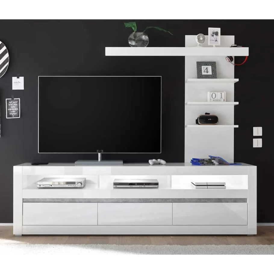 Die in Weiß Hochglanz tiefgezogene Folierung der Frontoberflächen und der Ablagenböden am Regal sorgt für eine luxuriöse und reflektierende Optik. Dieser Hochglanzeffekt, kombiniert mit einem Dekorstreifen in Beton-Optik am Lowboard, setzt moderne Akzente. Der in Weiß matt melaminbeschichtete Korpus und die Rückwand des Regals bieten nicht nur optische Kontraste, sondern sind auch äußerst pflegeleicht und kratzfest.