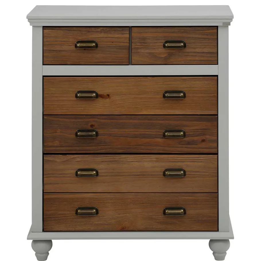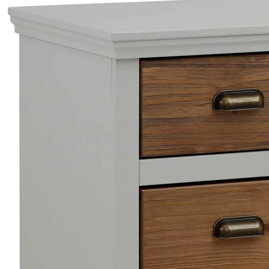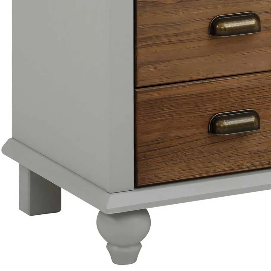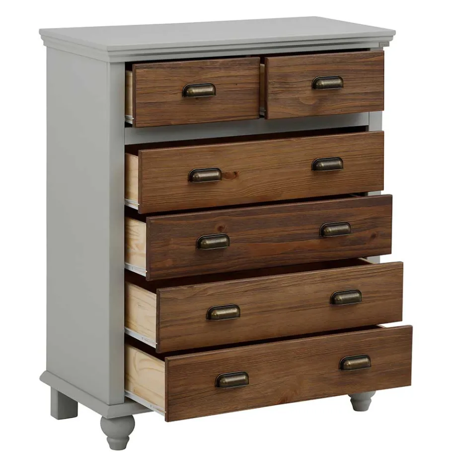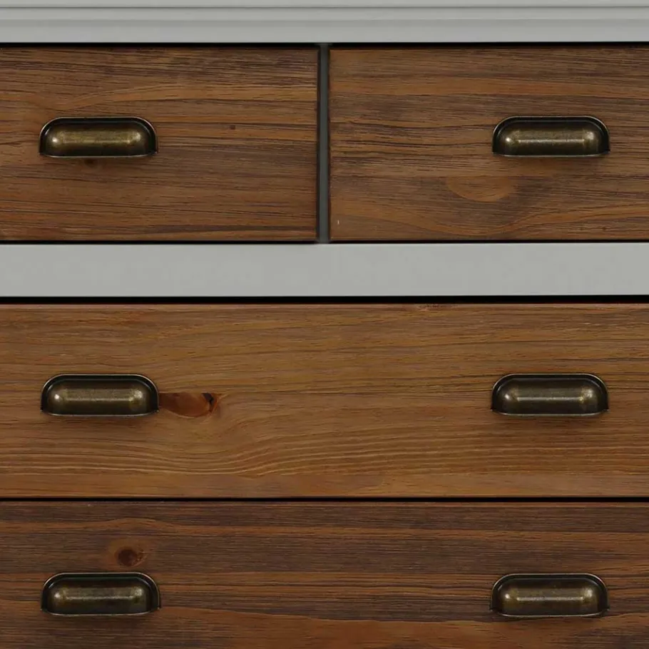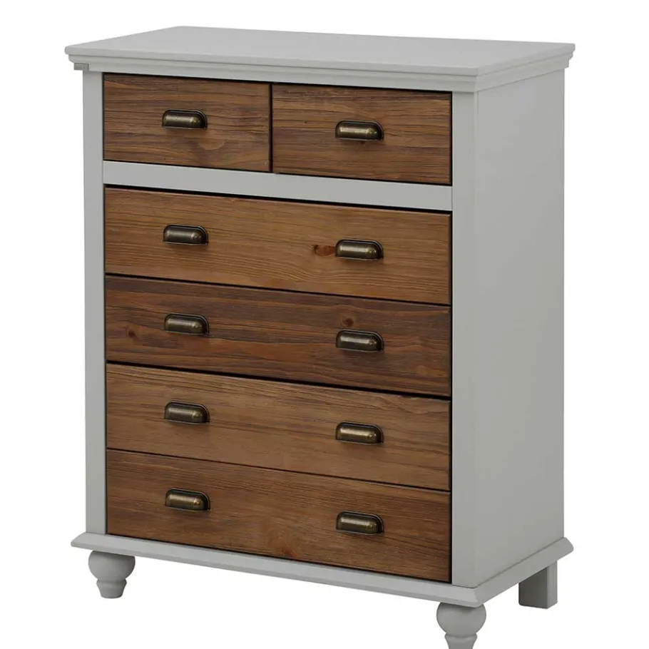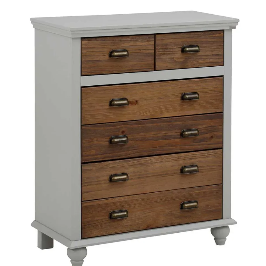 Die Hochkommode „Veproma“ vereint ländlichen Charme mit durchdachter Funktionalität. Ihr gelungenes Farbspiel aus warmem Holzbraun und sanftem Grau verleiht jedem Raum eine gemütliche Atmosphäre. Ob im Schlafzimmer, Flur oder Wohnbereich – dieses vielseitige Möbelstück schafft Ordnung und setzt zugleich stilvolle Akzente.