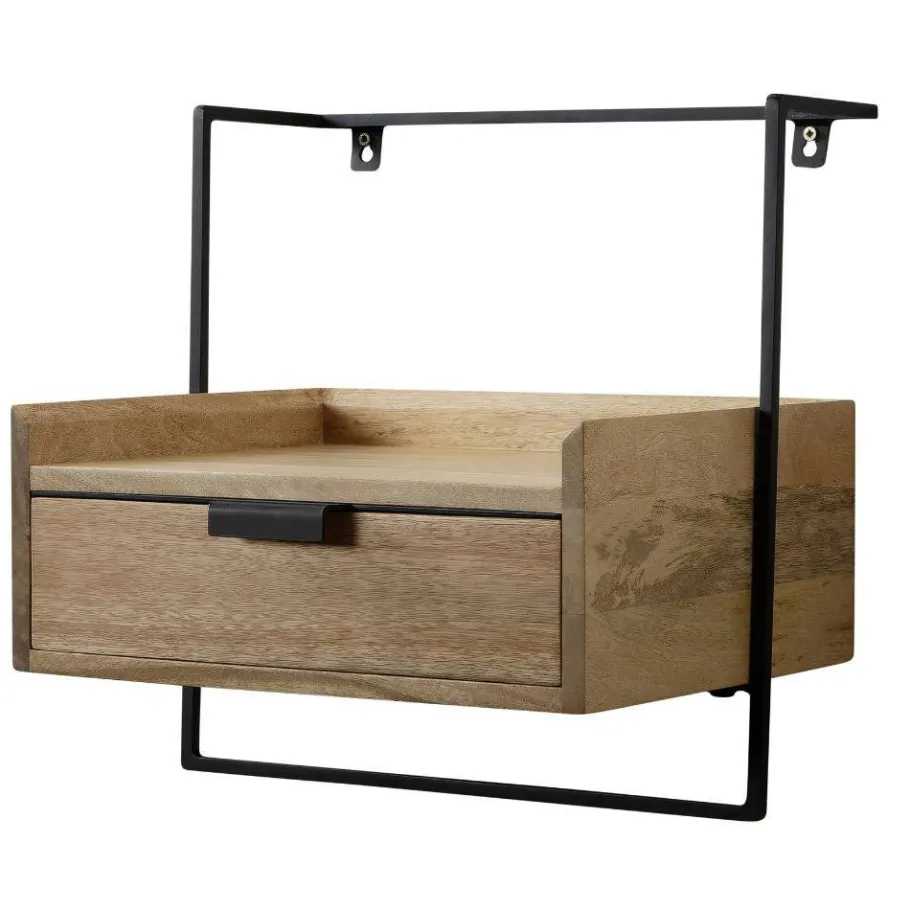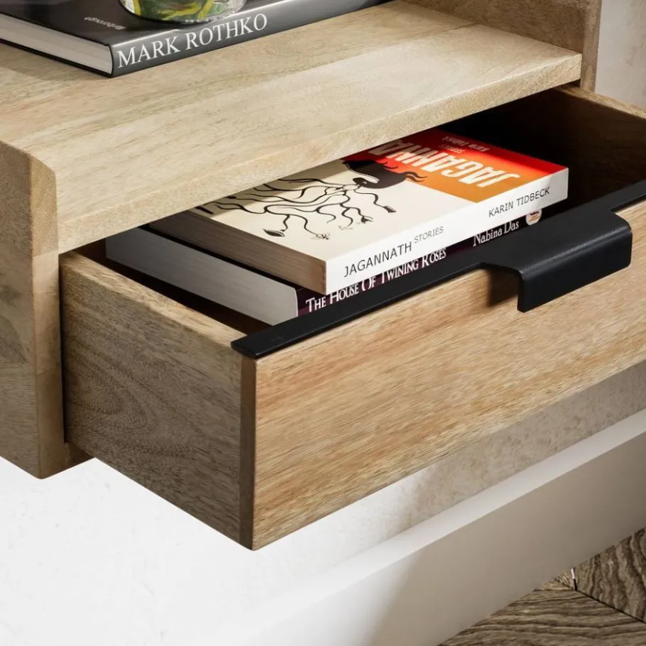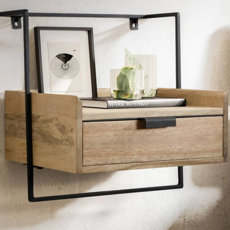 Die Nachtkonsole „Hanniba“ wird aus edlem Mangobaum Massivholz und robustem Metall gefertigt. Das Mangoholz besticht durch seine natürliche Maserung, die jedem Stück eine individuelle Note verleiht. Zudem sind die Oberflächen lackiert, wodurch sie nicht nur pflegeleicht, sondern auch widerstandsfähig sind. Das schwarze Eisen-Rahmengestell mit integrierter Wandhalterung ergänzt die Konstruktion und sorgt für Stabilität sowie eine moderne Ausstrahlung. Die Schublade ist mit einem Holzauszug und einem eleganten Metallkantengriff ausgestattet, der den Kontrast zwischen den Materialien harmonisch unterstreicht.