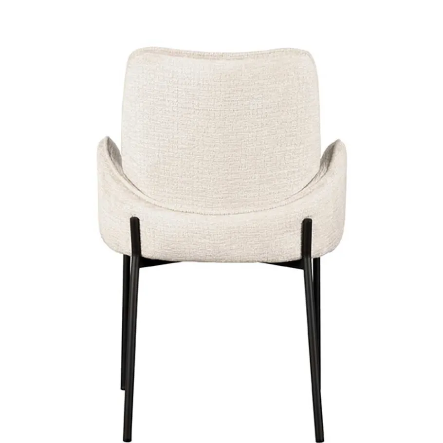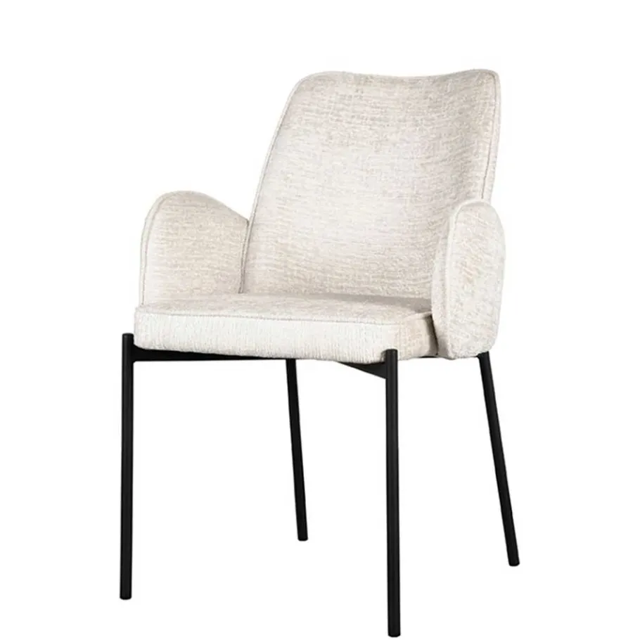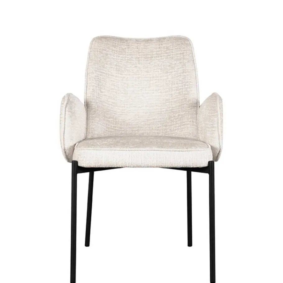 Mit dem Stuhl „Propanja“ holen Sie sich ein echtes Highlight in Ihren Essbereich. Die klaren Linien, das elegante Zusammenspiel aus cremeweißem Struktursamt und schwarzem Metallgestell sowie die feine, leicht nach hinten geneigte Rückenlehne machen ihn zu einem Designobjekt, das Ihre Einrichtung auf ein neues Niveau hebt. Dank der hohen, geraden Armlehnen und der harmonischen Formgebung genießen Sie nicht nur stilvolle Optik, sondern auch ein Sitzgefühl, das pure Entspannung verspricht.