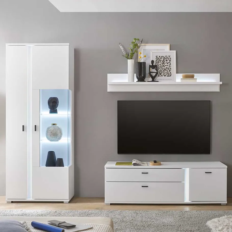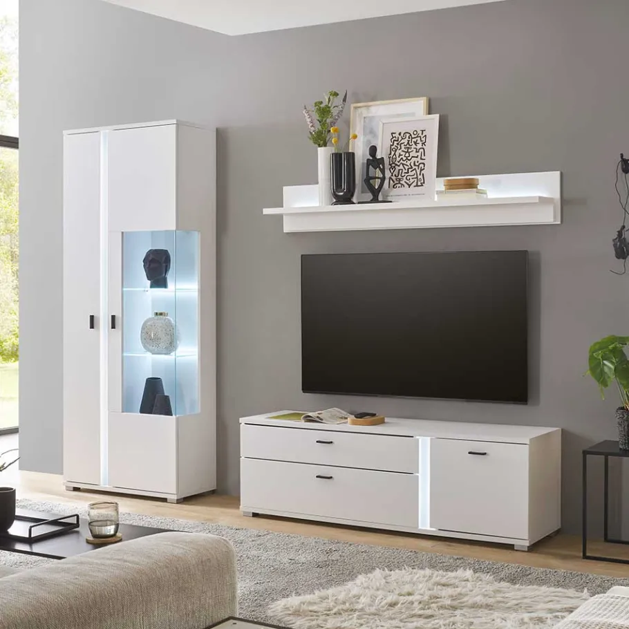 Eine stilvolle Wohnwand, die Ihr Wohnzimmer nicht nur verschönert, sondern auch Ihre Anforderungen an Funktionalität erfüllt, wird mit der TV Wohnwand Tirol Realität. Das moderne Design in strahlendem Weiß wird durch kontrastreiche schwarze Metall-Griffleisten ergänzt und zieht alle Blicke auf sich. Diese edle Farbkombination verleiht jedem Raum ein harmonisches und hochwertiges Ambiente. Klare Linien und ein puristischer Stil machen die Wohnwand zum zeitlosen Highlight, das sich in jeden modernen Einrichtungsstil perfekt einfügt.