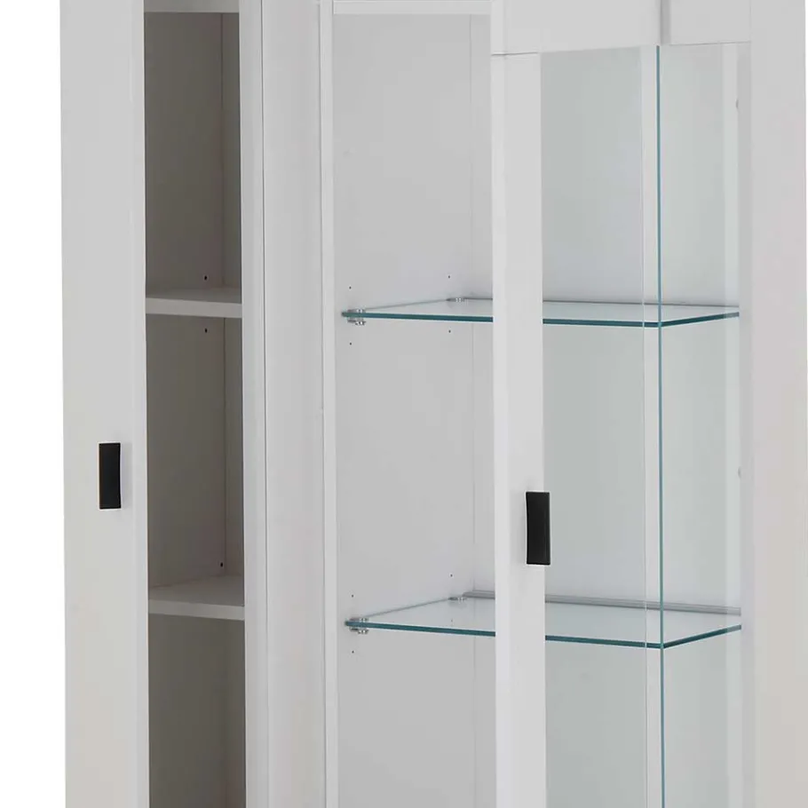 - Die Vitrine (80x200x35 cm): Ein eleganter Blickfang mit vielseitigen Nutzungsmöglichkeiten. Der Glaseinsatz, der sich rechts über Eck zieht, bringt Ihre schönsten Accessoires ins richtige Licht. Innen überzeugt die Vitrine mit fünf Einlegeböden auf der linken Seite sowie zwei Glasböden, zwei Konstruktionsböden und einem weiteren Einlegeboden auf der rechten Seite. Hier finden Bücher, Deko, Gläser oder Sammlerstücke ihren perfekten Platz.