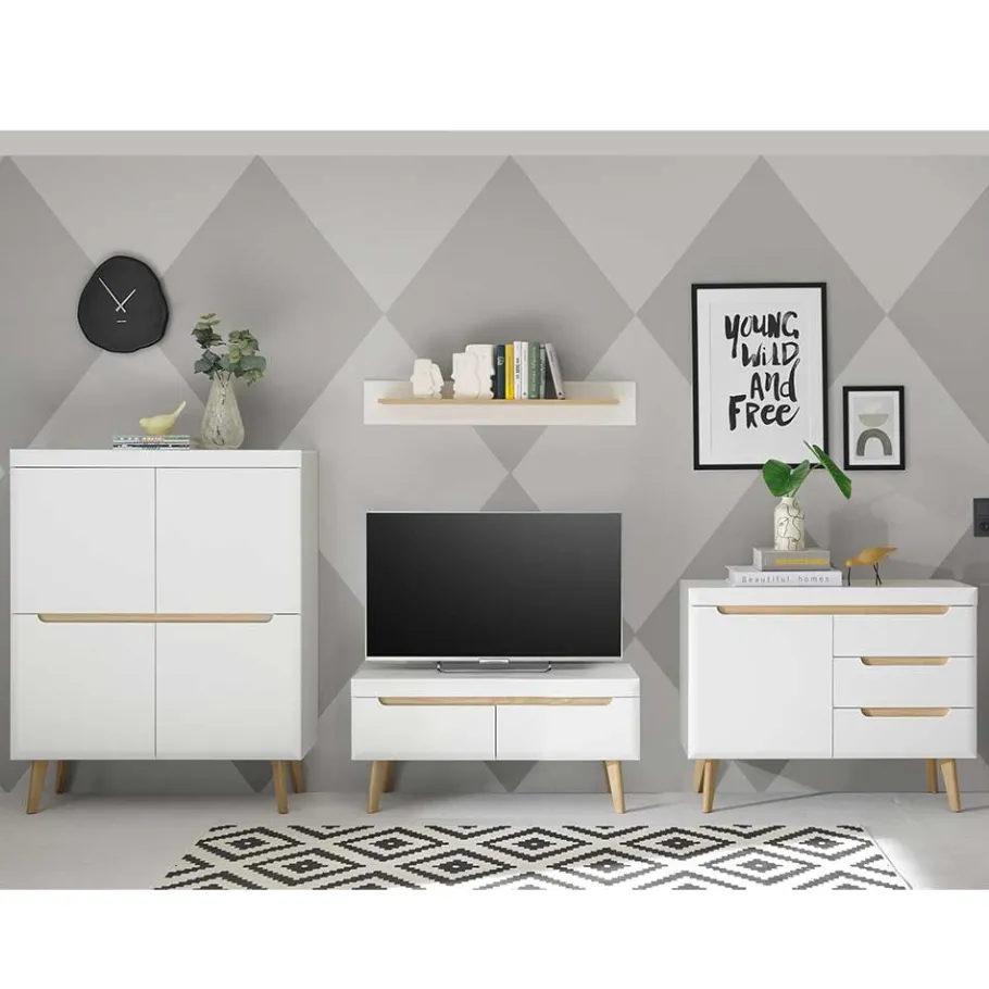 - Trendige Wohnwand in Weiß und Eichefarben