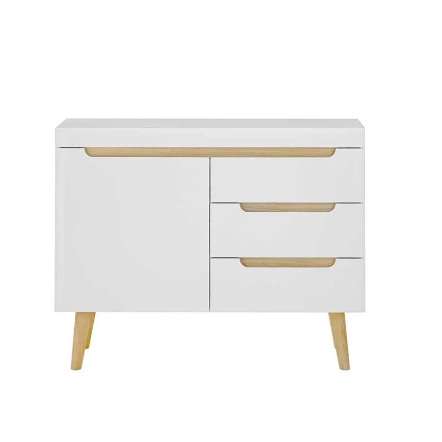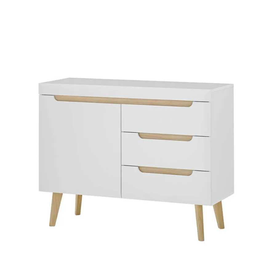 - Front weiß matt foliert, Kanten tiefgezogen, Korpus melaminbeschichtet, Absetzungen in Holzoptik foliert