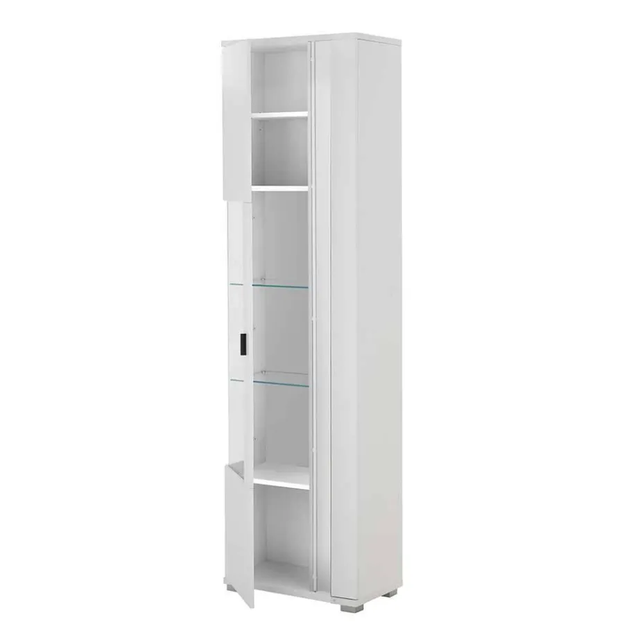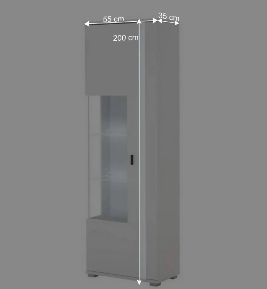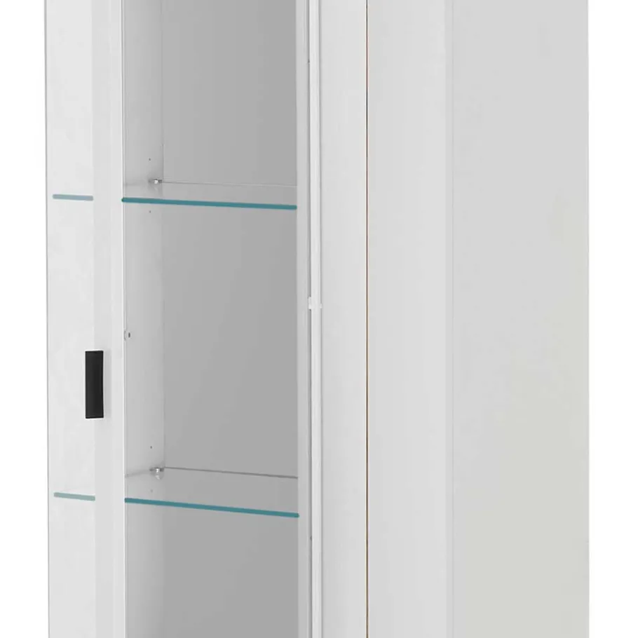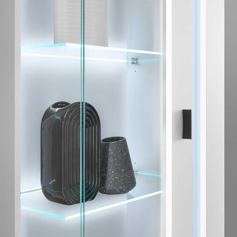 - Die Vitrinen: Zwei jeweils 200 cm hohe Vitrinen mit Glaseinsätzen über Eck setzen Ihre liebsten Deko-Elemente oder Sammlerstücke gekonnt in Szene. Die Glaselemente werden durch eine integrierte LED-Beleuchtung stilvoll betont. Jede Vitrine bietet eine durchdachte Innenaufteilung mit einem verstellbaren Einlegeboden, zwei Glasböden und zwei Konstruktionsböden – maximale Flexibilität für Ihre individuellen Aufbewahrungswünsche.