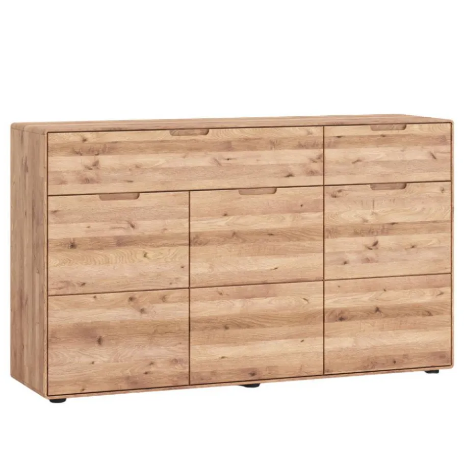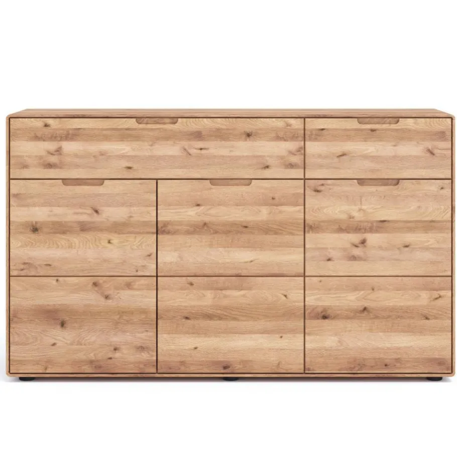 Eleganz trifft auf Natürlichkeit: Das Sideboard „Holiday“ ist weit mehr als ein einfaches Möbelstück. Es ist ein ausdrucksstarkes Designobjekt, das durch seine zeitlose Formsprache und die markante Schönheit massiver Wildeiche sofort alle Blicke auf sich zieht. Wer sein Zuhause mit Charakter und Qualität bereichern möchte, trifft mit diesem Sideboard eine Entscheidung für bleibende Werte und stilvollen Komfort.