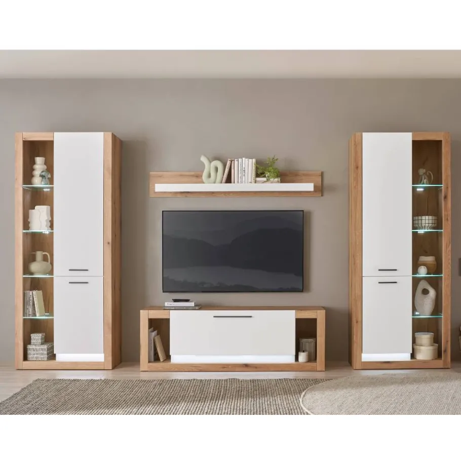 - Elegante Wohnwand in Weiß supermatt und Eichefarben