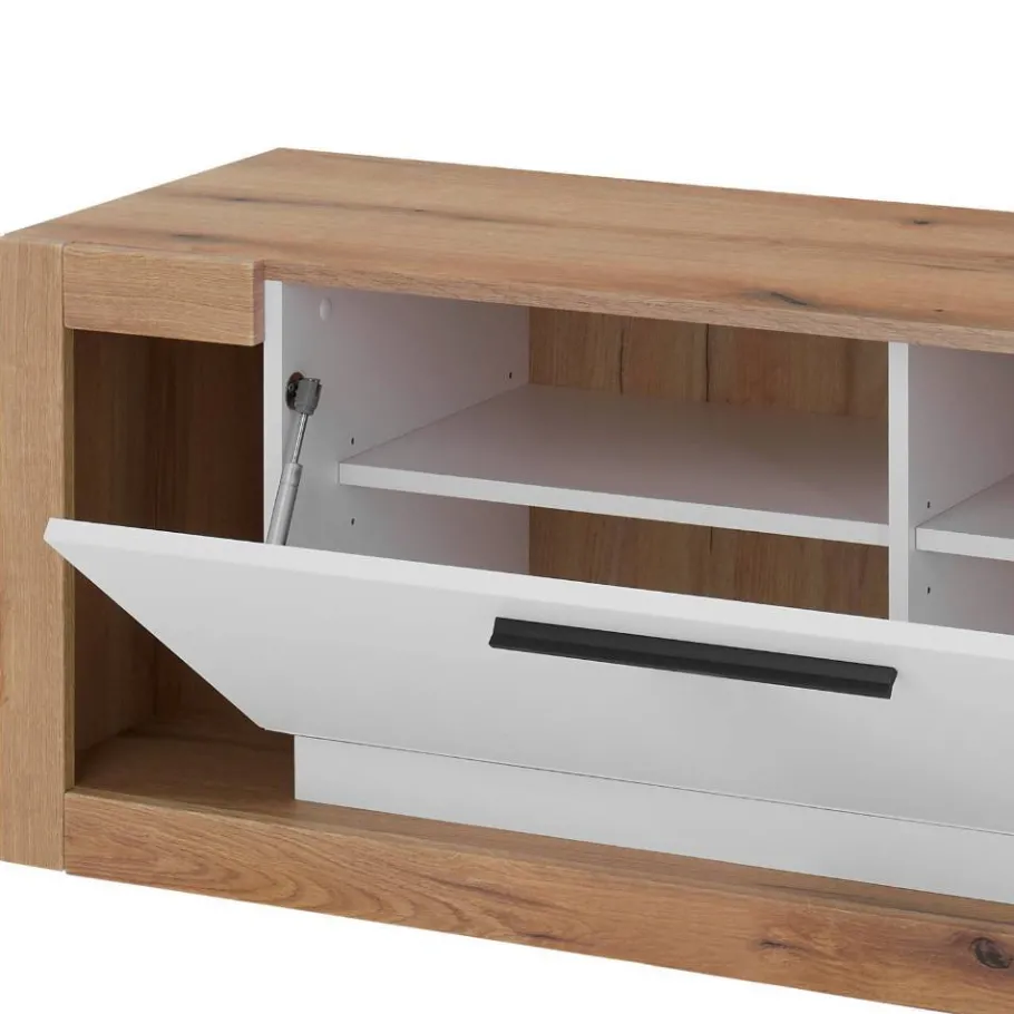 Das TV-Lowboard mit den Maßen 150x49x43 cm verfügt über eine Klappe mit zwei Einlegeböden und vier Fächern sowie jeweils ein offenes Fach an den Seiten – ideal für Multimedia-Geräte und stilvolle Präsentation. Das Wandboard misst 150x21x20 cm, ist mit einer beidseitig eingekürzten mattweißen Blende versehen und bietet eine Belastbarkeit von bis zu 3 kg für Bilderrahmen, Pflanzen oder andere Accessoires. Die Rückwand in Holzoptik Eiche setzt dabei natürliche Akzente.