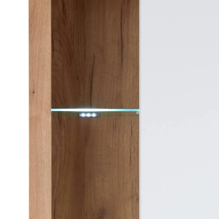 Die Fronten aus robustem MDF treffen auf einen stabilen Korpus aus Spanplatte. Die Oberflächen sind in Eiche-Natur-Optik foliert und tiefgezogen mattweiß foliert – ein harmonisches Zusammenspiel, das Natürlichkeit und moderne Leichtigkeit vermittelt. Schwarze Metall-Griffleisten sorgen für einen stilvollen Kontrast und ein komfortables Öffnen der Türen. Optional können Sie die Wohnwand mit LED-Beleuchtung bestellen, um die Möbel stimmungsvoll in Szene zu setzen.