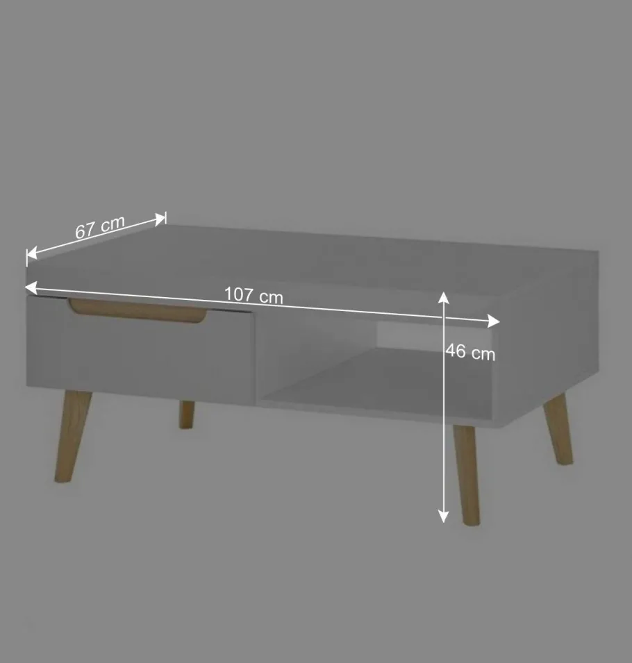 Mit Maßen von 107 cm Breite, 46 cm Höhe und 67 cm Tiefe bietet der Wohnzimmertisch „Ginko“ ausreichend Platz für Ihre Alltagsgegenstände und dekorative Elemente. Die glatte, pflegeleichte Tischplatte lädt nicht nur zum Kaffeetrinken ein, sondern dient auch als robuste Unterlage für Bücher, Tablets oder Spiele. Unterhalb der Tischplatte befinden sich zwei Schubladen mit einem Metallauszug, die einen leichtgängigen und geräuscharmen Betrieb garantieren. Integrierte Griffmulden in attraktiver Eichenfarbe erleichtern die Handhabung und fügen ein stilvolles Detail hinzu. Die offene Ablage bietet zusätzlichen Raum für Zeitschriften, Fernbedienungen oder Ihre Lieblingsbücher.
