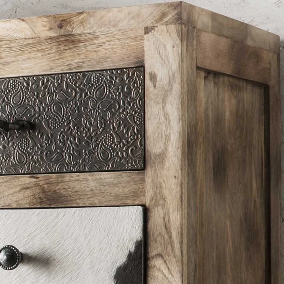 - Holzoberfläche mit White Wash Effekt behandelt, Metall in Schwarz lackiert, Fronten teils mit echtem Ziegenfell und messingfarbigem Metall verziert