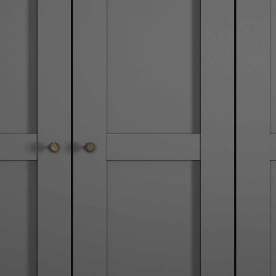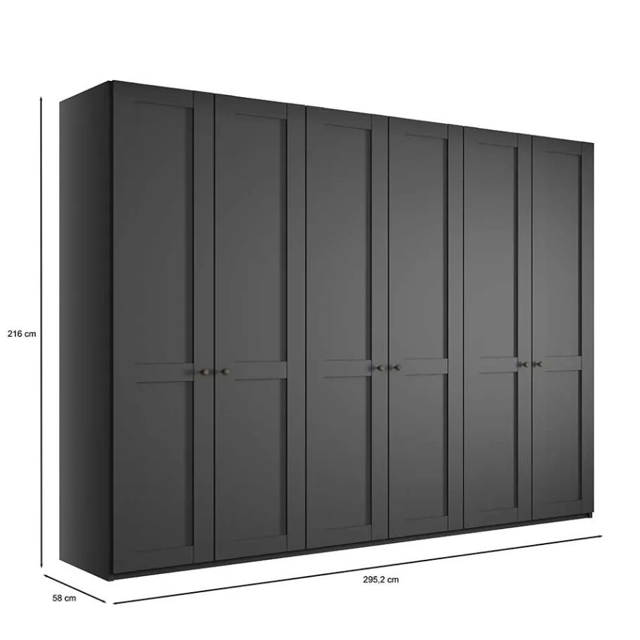 Mit einer Breite von 300 cm, einer Höhe von 216 cm und einer Tiefe von 58 cm bietet dieser Schrank ausreichend Stauraum für all Ihre Kleidungsstücke und Accessoires. Die sechs Drehtüren sind mit einer Soft-Close-Funktion und Metallbeschlägen ausgestattet. Diese sorgen für ein sanftes und leises Schließen der Türen. Das besondere Highlight sind die Türfronten, die in einer dezenten Kassettenoptik gestaltet sind. Im Inneren überzeugen drei Fachelemente mit jeweils zwei Einlegeböden und einer Kleiderstange, während runde Metall-Knopfgriffe in Altsilberfarben das Design abrunden.