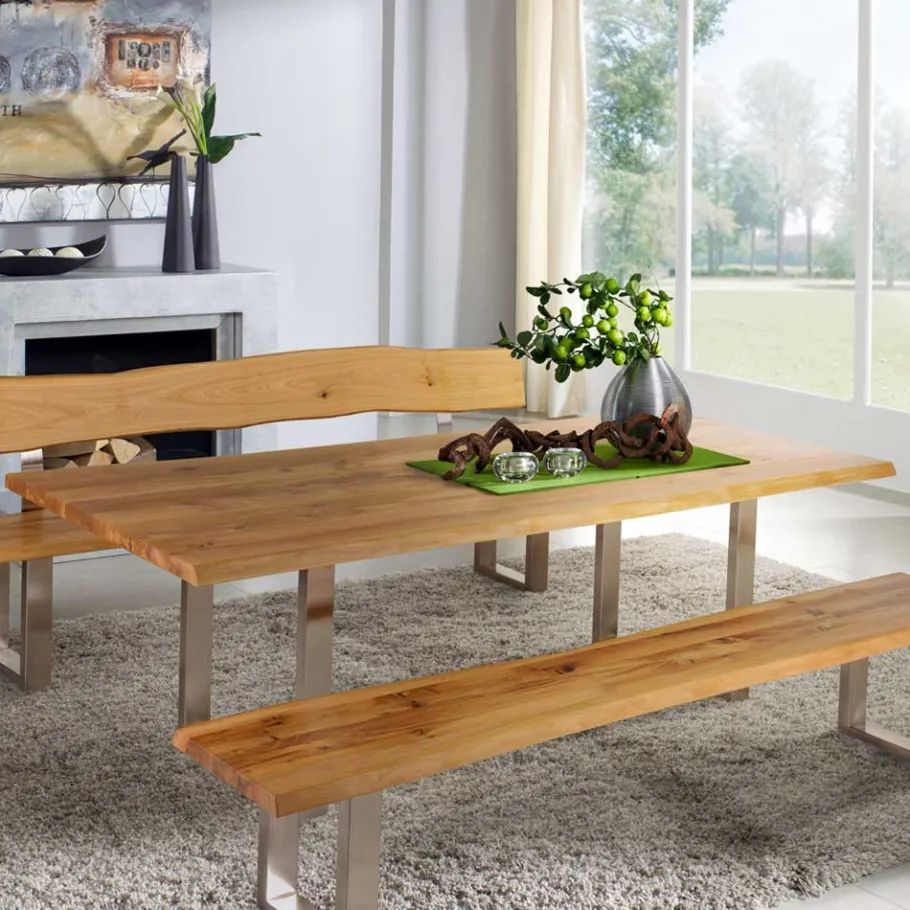 Der Esstisch „Cantinos“ besticht durch seine klassische, rechteckige Formgebung, die durch die einzigartige Baumkante, ein natürlicher, ungeschnittener Rand des Holzes, abgerundet wird. Jeder Tisch ist ein Unikat, geprägt von der individuellen Form und Textur der Baumkante. Diese Baumkante verleiht dem Tisch seinen besonderen Charme und macht ihn zu einem echten Hingucker in jedem Esszimmer.