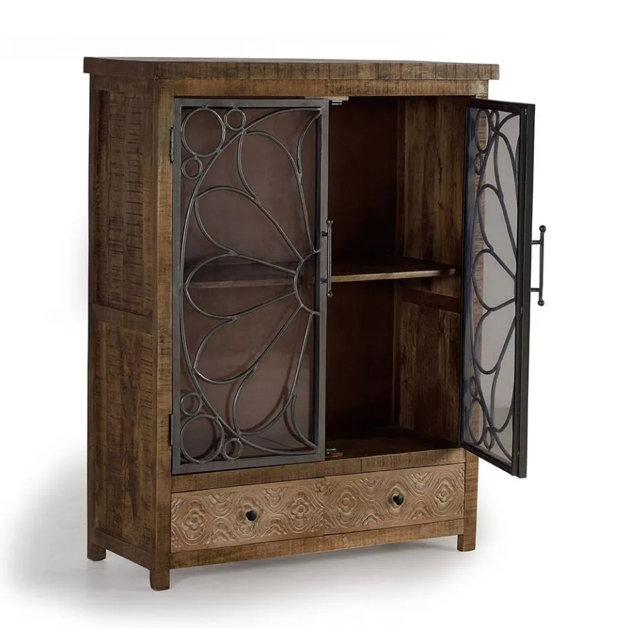 Gefertigt aus massivem Mangoholz in natürlichem Finish, überzeugt das Highboard mit einer markanten Oberflächenstruktur, die durch realitätsnahe Gebrauchsspuren betont wird. Die Glastüren werden von robusten Metallrahmen eingefasst und mit zarten Metallornamenten kunstvoll verziert. Stabile Holzfüße sorgen für einen sicheren Stand und runden das harmonische Materialensemble perfekt ab.