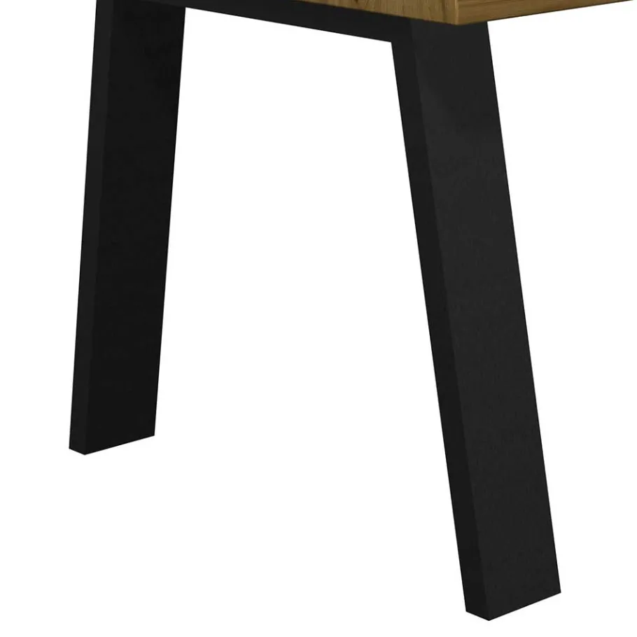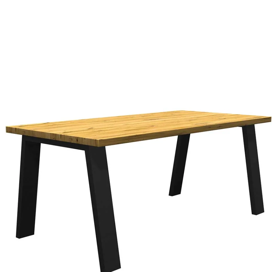Zur Fertigung des Tisches Miley kommen massive Eiche und Metall in Kombination zum Einsatz. Während die Platte des Tisches aus etwa 4 cm starkem Eichenholz mit geölten Oberflächen im Naturfarbton gefertigt ist, besteht das Gestell aus Metall mit Pulverbeschichtung in Schwarz. Die vier breiten Metallbeine zeigen einen leicht schrägen Verlauf, was für eine sehr interessante Optik sorgt.