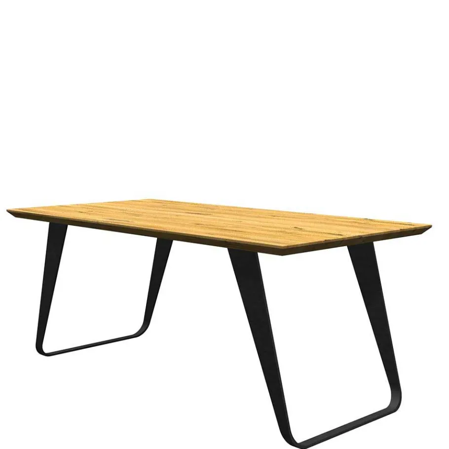 Zwei massive Bügel aus in Schwarz pulverbeschichtetem Metall tragen die Holzplatte des Tisches Lash sicher und stabil. Sie verjüngen sich nach unten hin und zeigen insgesamt einen schrägen Verlauf, was den außergewöhnlichen Look des Tisches noch einmal unterstreicht.