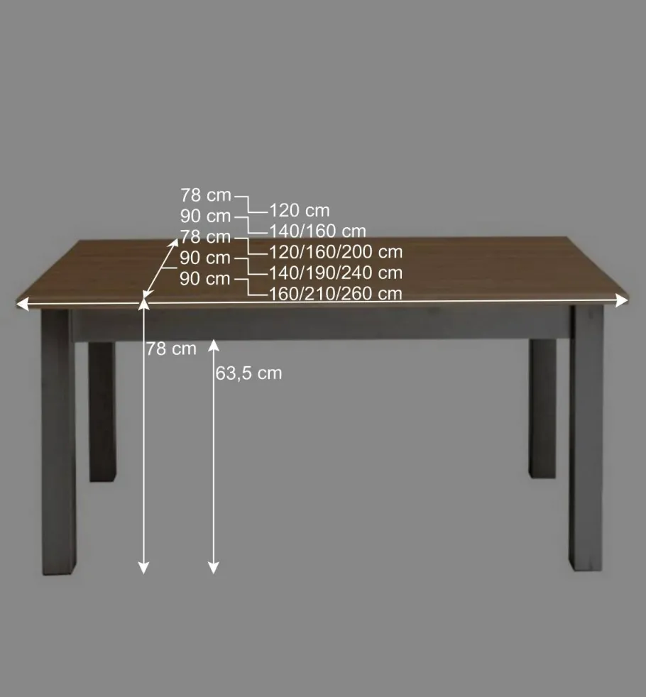 - 006: Breite: 260 / Tiefe: 90 / verlängerbar um je 50 cm, von 160 bis auf 260 cm / mit zwei Ansteckplatten / für acht Personen