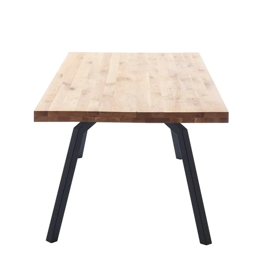 Gefertigt aus massivem Balkeneichenholz und robustem Stahl, punktet der Tisch mit hoher Stabilität und Langlebigkeit. Die natürlich geölte Oberfläche betont die schöne Maserung des Holzes, während das abgewinkelte Gestell aus Vierkantrohr (5×5 cm) dem Tisch einen industriellen Look verleiht. Die Tischplatte mit durchgehender Lamellenverarbeitung und 2,5 cm starker Grundplatte ist am Rand auf 5 cm aufgedoppelt – ein Qualitätsmerkmal, das man sieht und spürt.