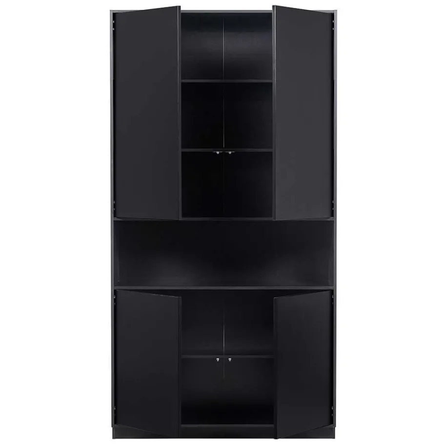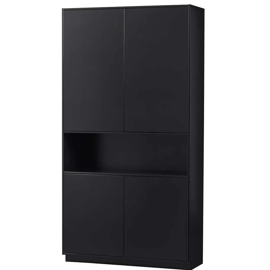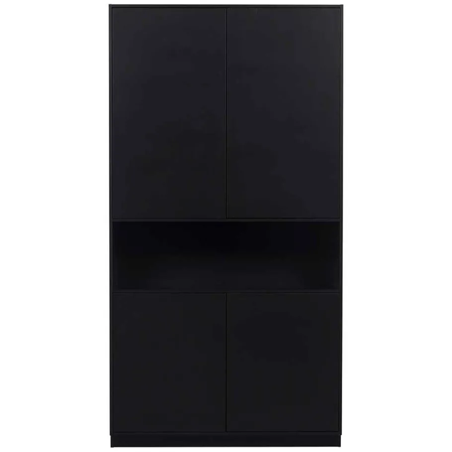 Die matt tiefschwarz lackierten Oberflächen (RAL9005) sind innen mit Melamin beschichtet. Diese Lackierung sorgt nicht nur für eine elegante Optik, sondern schützt die Oberfläche auch vor Kratzern und Abnutzung. RAL9005 steht für eine spezielle Farbcodierung, die tiefschwarz entspricht, und garantiert eine gleichbleibende Farbqualität. Melaminbeschichtungen sind bekannt für ihre Widerstandsfähigkeit und Pflegeleichtigkeit – ein großer Vorteil im Alltag. Diese hochwertige Beschichtung sorgt dafür, dass die Oberflächen der Wohnwand „Niwidus“ auch nach jahrelangem Gebrauch noch wie neu aussehen.