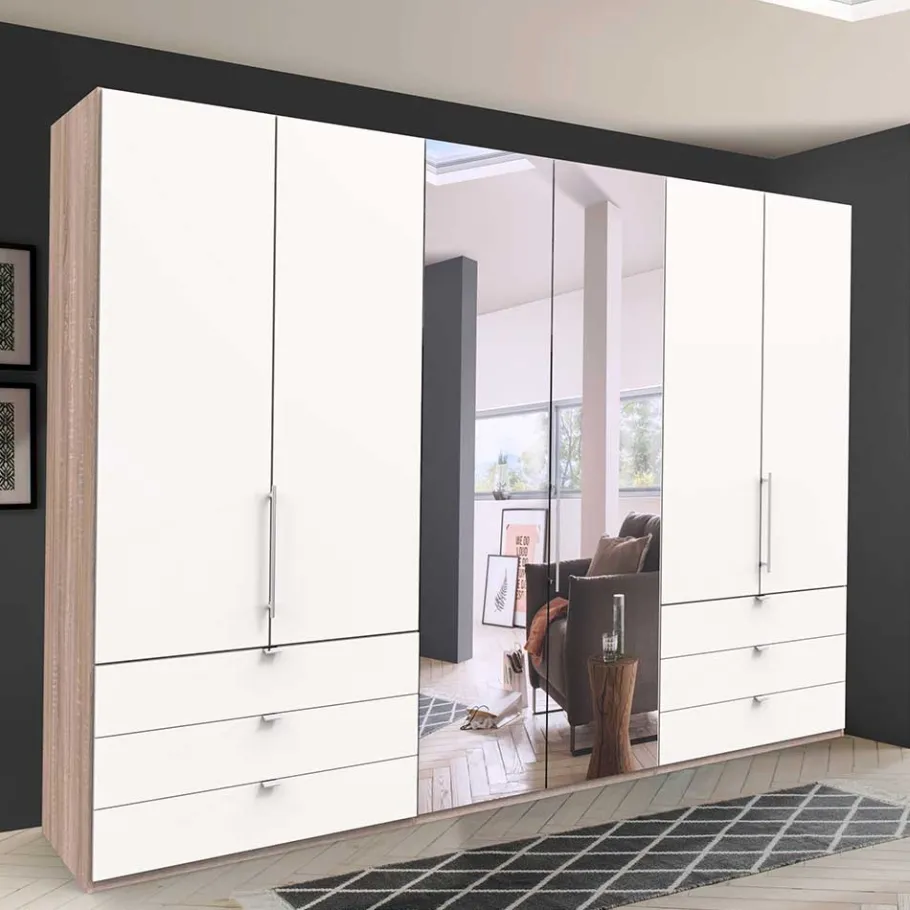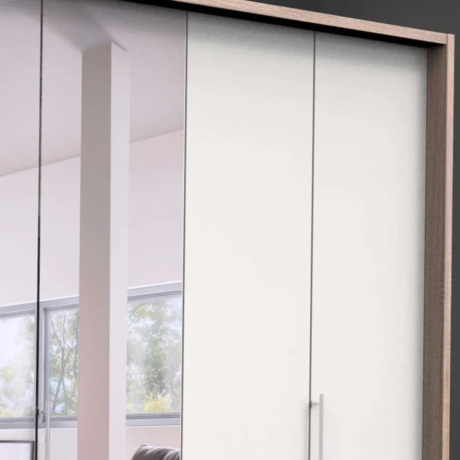 Die Schranktüren sind so konzipiert, dass sie wie Falttüren nach vorne gezogen werden können. Diese Konstruktion ist besonders platzsparend und ermöglicht einen schnellen, unkomplizierten Zugang zu Ihren Sachen. Die Fronten der beiden mittigen Türen sind mit zwei großen Spiegelflächen in Parsol Bronze ausgestattet, die einen stilvollen Kontrast zum weißen Korpus bieten und gleichzeitig Ihre Räumlichkeit optisch vergrößern.