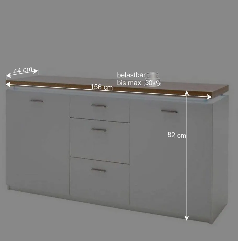 Dank des nach hinten gestellten Sockelgestells steht das Sideboard stabil und sicher. Diese Konstruktion verhindert Wackeln und sorgt für eine gleichmäßige Lastenverteilung. Auch bei hoher Belastung bleibt Ihr Sideboard stets standfest. Mit einer maximalen Belastbarkeit des Oberbodens von 30 kg haben Sie genug Platz für Ihre Dekoration oder Elektronikgeräte.