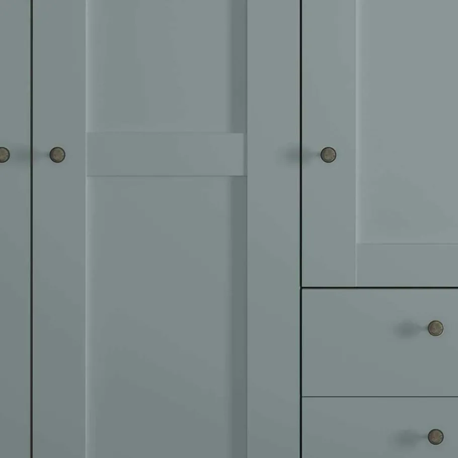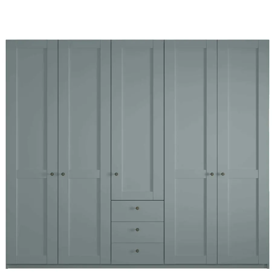 Mit Maßen von 250 cm Breite, 216 cm Höhe und 58 cm Tiefe bietet dieser Schrank nicht nur optisch, sondern auch funktional einen wahren Mehrwert. Er überzeugt durch fünf Drehtüren mit einer Soft-Close-Funktion, die für ein leises und sanftes Schließen der Türen sorgt. Die integrierten Metallbeschläge gewährleisten dabei Langlebigkeit und Stabilität. Für eine stimmige Optik sorgen die Türfronten, die in einer dezenten Kassettenoptik gestaltet sind.