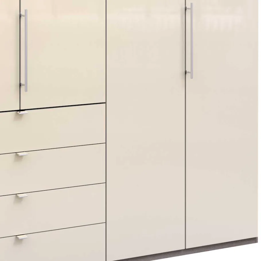 Angefertigt aus robuster Spanplatte, gewährleistet dieser Schrank eine langlebige Stabilität. Der Korpus präsentiert sich in einer stilvollen Holzoptik und ist Eiche Trüffelfarben foliert. Folieren bedeutet hierbei, dass das Material mit einer besonderen Schicht überzogen ist, die für eine ansprechende Optik sorgt, während sie gleichzeitig schützt. Als besonderer Eyecatcher erstrahlen die Fronten des Kleiderschrankes in einem eleganten Cremeton, der mit einer Glasbeschichtung veredelt wurde.