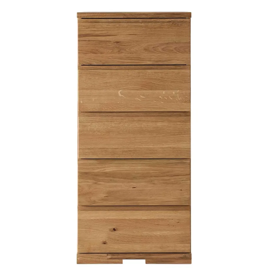 Die fünf Schubladen der Kommode sind mit Metallauszügen ausgestattet und verfügen über eine Soft-Close-Funktion sowie einen Selbsteinzug, was für einen leisen und sanften Schließmechanismus sorgt. Die dezent ausgefrästen Griffmulden runden das ästhetische Design ab und sorgen für eine einfache Handhabung.