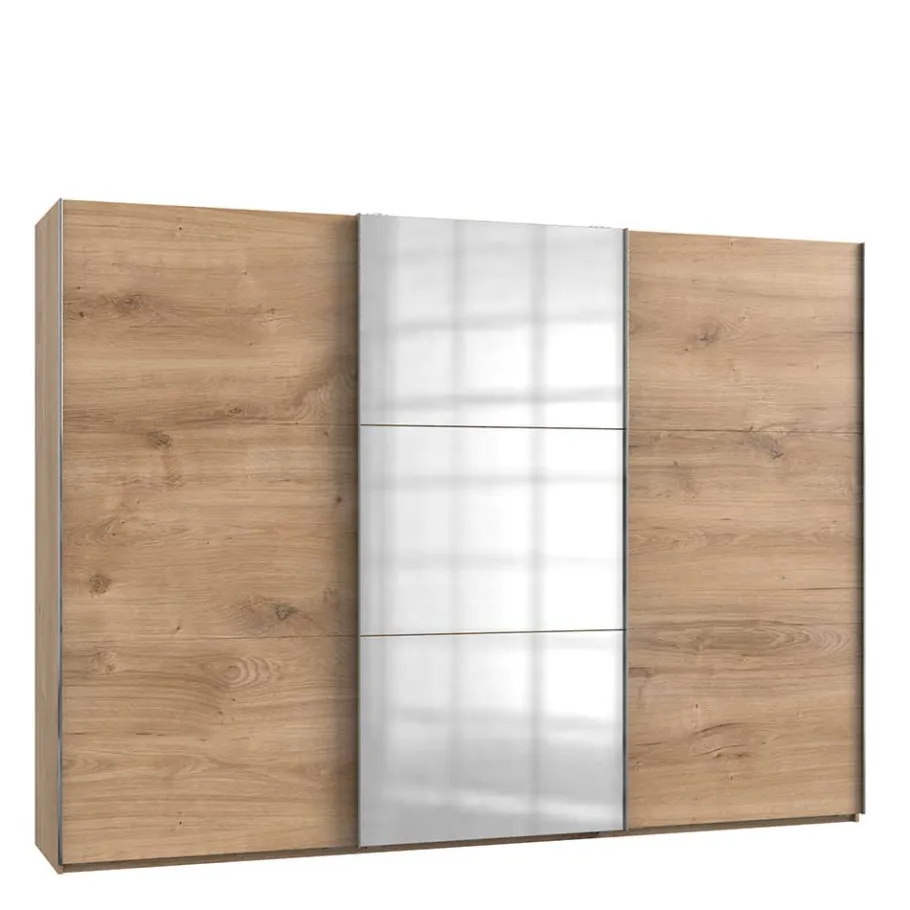 Die drei Schwebetüren gleiten sanft und leise, ermöglicht durch hochwertige Beschläge und Führungen. Die mittlere Tür ist mit einem großzügigen Ganzkörperspiegel ausgestattet, der nicht nur praktisch für die tägliche Outfit-Wahl ist, sondern auch optisch den Raum vergrößert. Die handlichen Metall-Griffleisten in Chromfarben erleichtern das Öffnen und Schließen und setzen einen eleganten, farblichen Kontrast.
