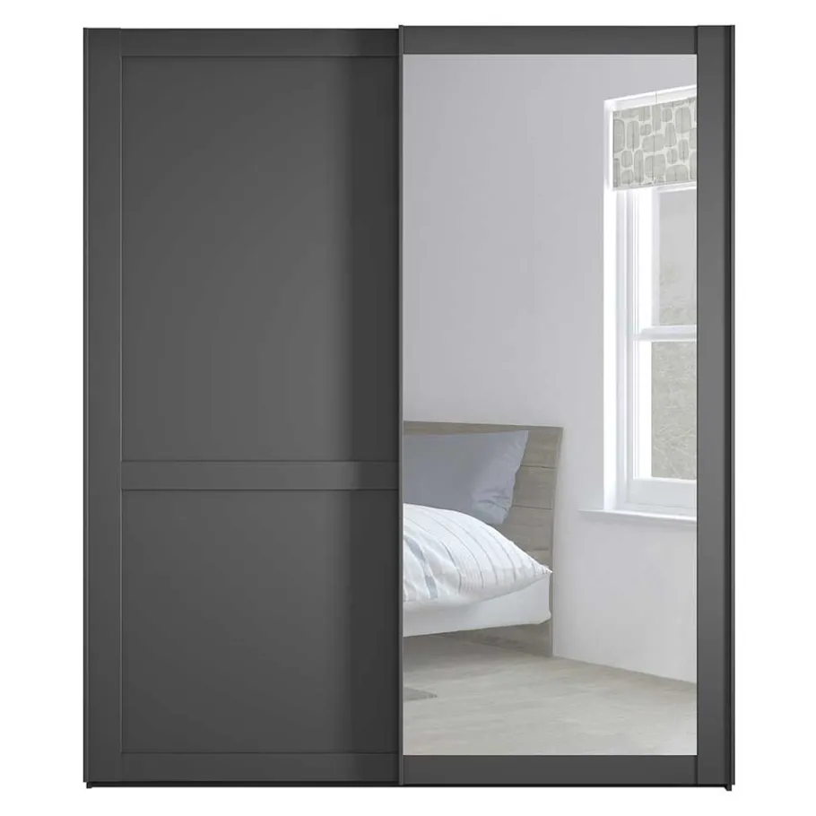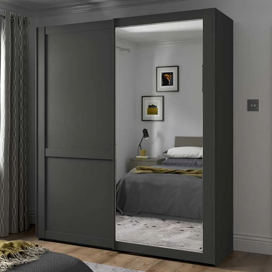 Mit seinen imposanten Abmessungen von 217 cm Höhe, 67 cm Tiefe und wahlweise 150 cm oder 200 cm Breite bietet der „Mataram“ ausreichend Stauraum für Ihre Kleidung und persönlichen Gegenstände. Die zwei leichtgängigen Schwebetüren lassen sich mühelos öffnen und schließen, während die dezente Kassettenoptik der Türfronten dem Schrank eine elegante Note verleiht.