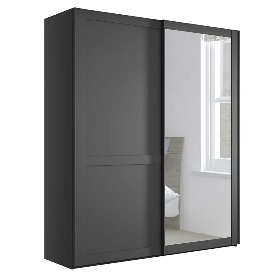 Der Schwebetürenschrank „Mataram“ verkörpert die perfekte Symbiose aus modernem Design und dem zeitlosen Charme des Landhausstils. Hergestellt in Deutschland aus hochwertiger Spanplatte, zeichnet sich dieses Möbelstück durch seine erstklassige Verarbeitung und Materialqualität aus. Die strapazierfähige, dunkelgraue Folie der äußeren Oberflächen harmoniert perfekt mit dem hellgrauen Holzoptik-Innendekor, was eine ansprechende und leicht kombinierbare Farbgebung ergibt.