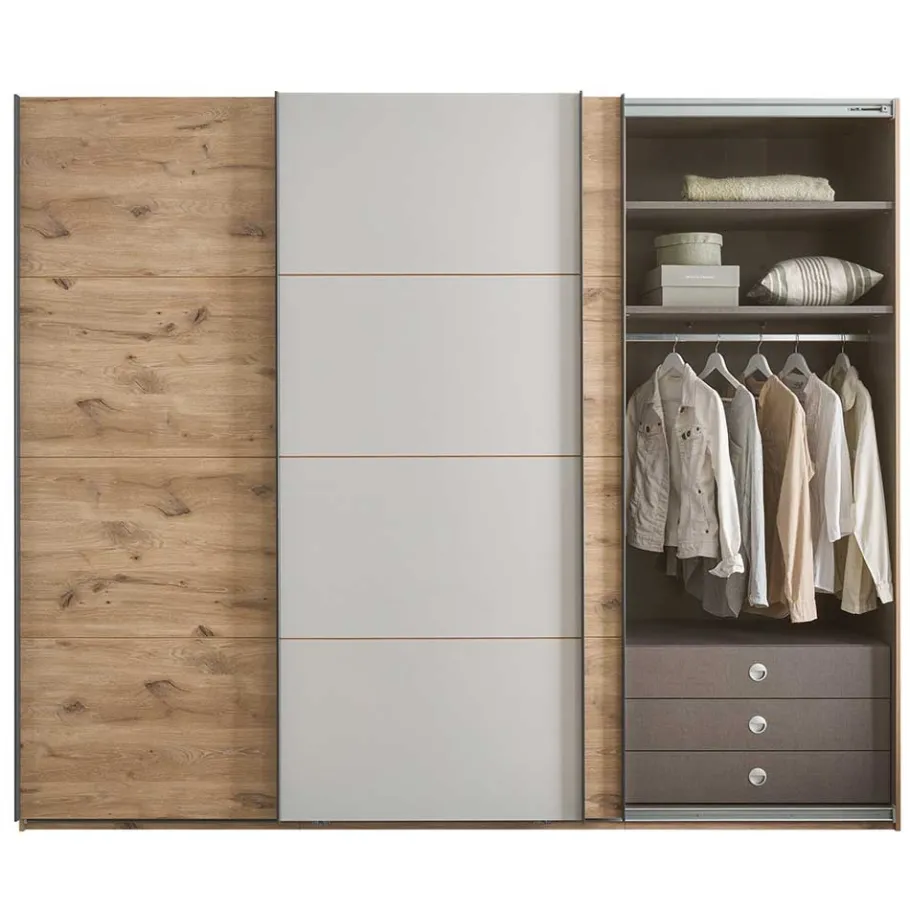 - Modern präsentiert sich dieser Schrank in Wildeiche hell und Grau