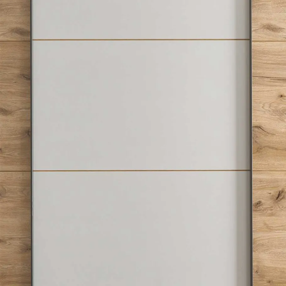 Die optisch geteilten Fronten des Schranks sind aufwändig gestaltet und setzen durch die in Grau abgesetzte mittlere Türfront stilvolle Akzente. Die schlanken Metallgriffe in Anthrazit unterstreichen den modernen Look und sorgen dafür, dass sich die Türen mühelos öffnen und schließen lassen. Hinter den Türen verbergen sich drei Facheinheiten: links befinden sich vier Einlegeböden, während sich mittig und rechts jeweils zwei Einlegeböden und eine stabile Kleiderstange aus Metall finden. Diese intelligente Aufteilung bietet ausreichend Platz für Kleidung, Accessoires und vieles mehr.