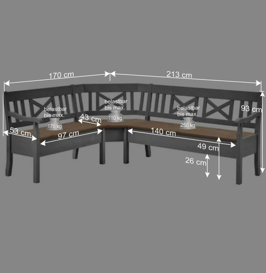 Mit einer komfortablen Sitzhöhe von ca. 49 cm, sanft geschwungenen Armlehnen und einer aufwendig gearbeiteten Rückenlehne mit Kreuzelementen bietet diese Bank Sitzkomfort auf hohem Niveau. Die durchdachte Winkelform (Schenkelmaße 213 x 170 cm) spart nicht nur Platz, sondern ermöglicht eine flexible Raumgestaltung – auch spiegelverkehrt montierbar. Das massive Fußgestell sorgt für hohe Stabilität und eine beeindruckende Tragfähigkeit: Bis zu 250 kg auf dem langen Schenkel – Qualität, auf die Sie sich verlassen können.