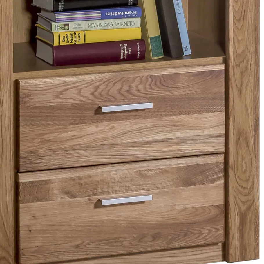 Hergestellt aus massiver Wildeiche an der Front und qualitativer Spanplatte am Korpus, kombiniert „Maila“ Robustheit mit Ästhetik. Die natürlich geölten Holzoberflächen betonen die lebendige Maserung der Wildeiche, während die in Holzoptik folierte Spanplatte Beständigkeit und Pflegeleichtigkeit garantiert. Die Folierung, ein Veredelungsprozess, schützt das Material und sorgt für eine attraktive, langlebige Oberfläche, die sich leicht reinigen lässt.