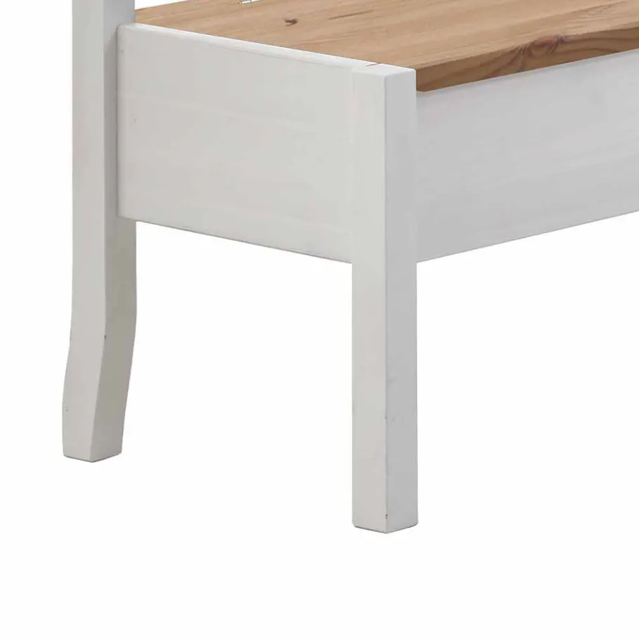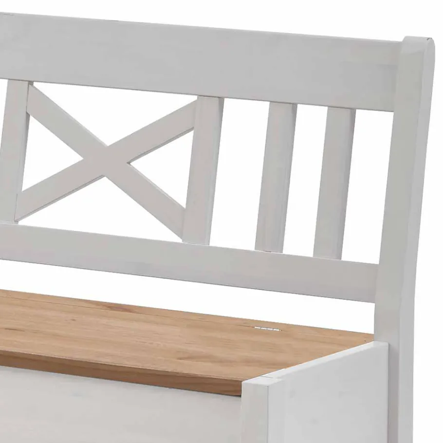 Die Holzoberflächen sind kunstvoll in Weiß gebeizt und lackiert, wodurch die natürliche Maserung der Kiefer dezent durchscheint. Ein Teil der Bank ist in Laugenfarbig gebeizt und geölt, was einen rustikalen Touch verleiht.
