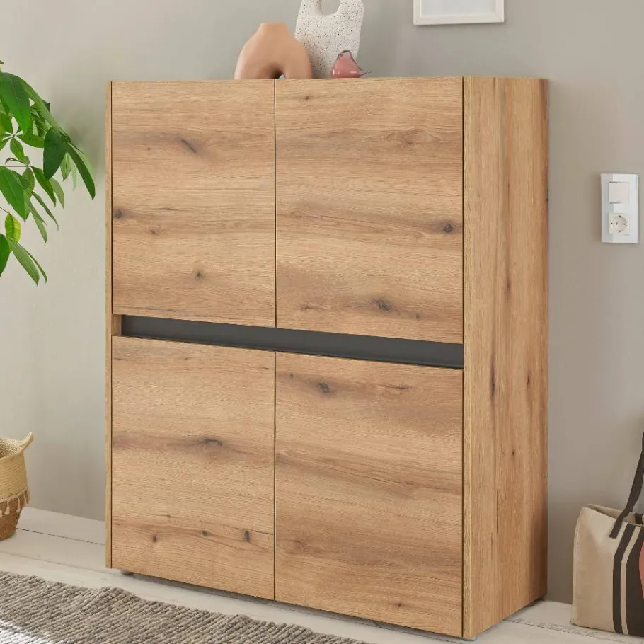 Material und Verarbeitung Gefertigt aus hochwertiger Spanplatte, sind alle Elemente mit pflegeleichten, melaminbeschichteten Oberflächen in Wildeiche Holzdekor und Anthrazit versehen. Die Korpusmöbel stehen auf flachen Kunststofffüßen und sollten zur Kippsicherung zusätzlich an der Wand befestigt werden. Die grifflosen Fronten werden über leicht zurückgesetzte Blenden in Anthrazit geöffnet, die als dezente Griffmulden fungieren. Stabile Metallbeschläge sorgen für langlebige Funktionalität.