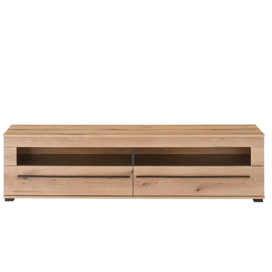 Die lange Griffleisten in elegantem Schwarz setzen einen spannenden optischen Kontrast und liegen perfekt in der Hand. Türen mit robusten Metallbeschlägen und Schubladen mit hochwertigen Metallauszügen bieten eine langlebige und komfortable Handhabung. Das TV-Lowboard mit seinen zwei offenen Gerätefächern schafft Ordnung und Platz für Ihre Technik, während die beiden Wandboards mit eingekürzten Ablagen samt Blenden stilvolle Flächen für Deko oder Bücher bereithalten. Einlegeböden tragen bis zu 5 kg, Glasböden bis zu 3 kg – optional mit moderner LED-Beleuchtung, die Ihre Lieblingsstücke in stimmungsvolles Licht taucht und Abende noch gemütlicher macht.