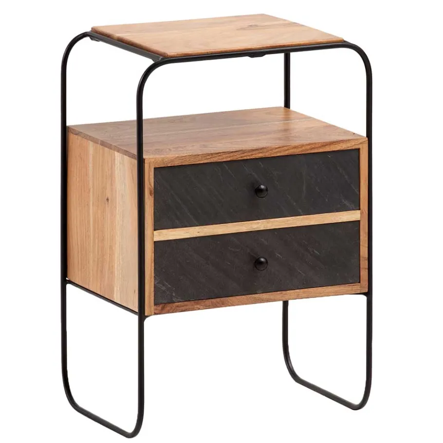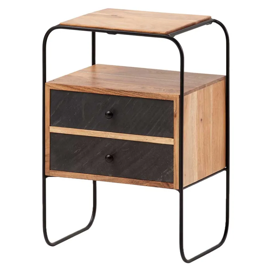 Die zweifarbige Nachtkommode „Avalun“ vereint modernes Design mit funktionaler Eleganz. Ihr einzigartiger Look in Akazie Natur und Schwarz macht sie zum Highlight in jedem Schlafzimmer. Mit ihrer filigranen Metall-Bügelgestell und den charmanten Rundungen steht sie sicher und stabil. Perfekt für jeden, der ein stilvolles und zugleich praktisches Möbelstück sucht. Die Kommode „Avalun“ wird in Handarbeit gefertigt und ist somit ein echtes Unikat – kleine Abweichungen unterstreichen ihren individuellen Charakter.