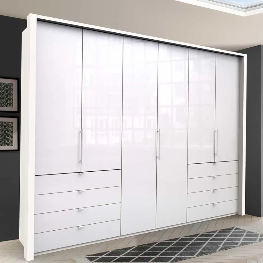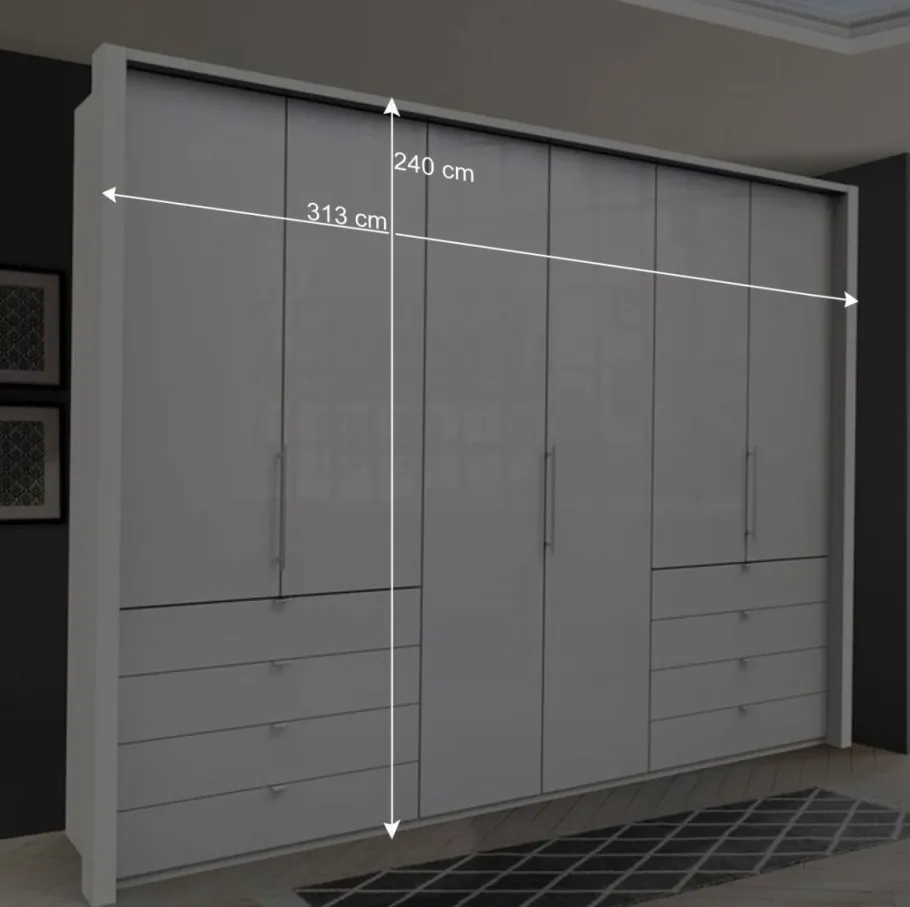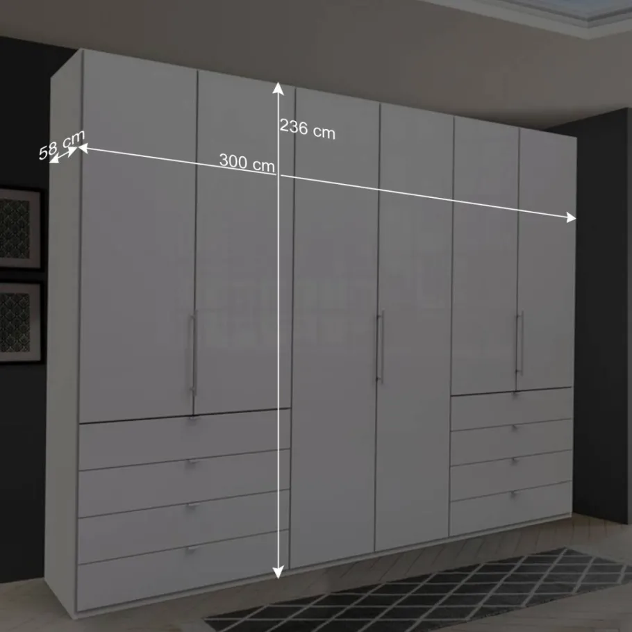 Mit seinen beeindruckenden Maßen von 300 cm Breite, 58 cm Tiefe und 216 cm Höhe (ohne Passepartout-Rahmen) bietet der „Dolienca“ Ihnen einen großzügigen Stauraum für Ihre Kleidung und persönlichen Gegenstände. Die drei Panorama-Falttüren in einer Sechs-Türen-Optik lassen sich einfach nach vorne ziehen und sparen somit wertvollen Platz in Ihrem Schlafzimmer.