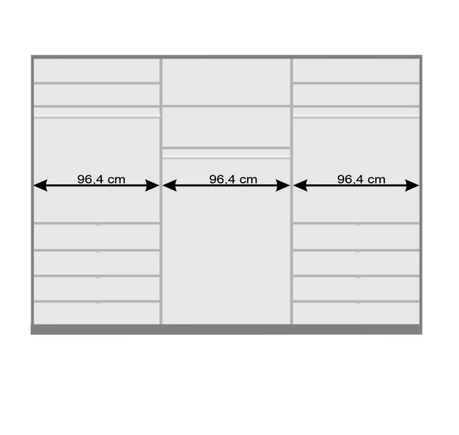 Die runden Stangengriffe aus Metall verleihen dem Schrank eine moderne Note und ermöglichen ein müheloses Öffnen und Schließen der Türen. Im Inneren finden Sie drei Fachelemente, jeweils mit zwei Einlegeböden und einer Kleiderstange aus Metall ausgestattet. So haben Sie ausreichend Platz für Ihre Kleidung, Schuhe und Accessoires. Die Breite der einzelnen Elemente beträgt innen jeweils 96,4 cm.