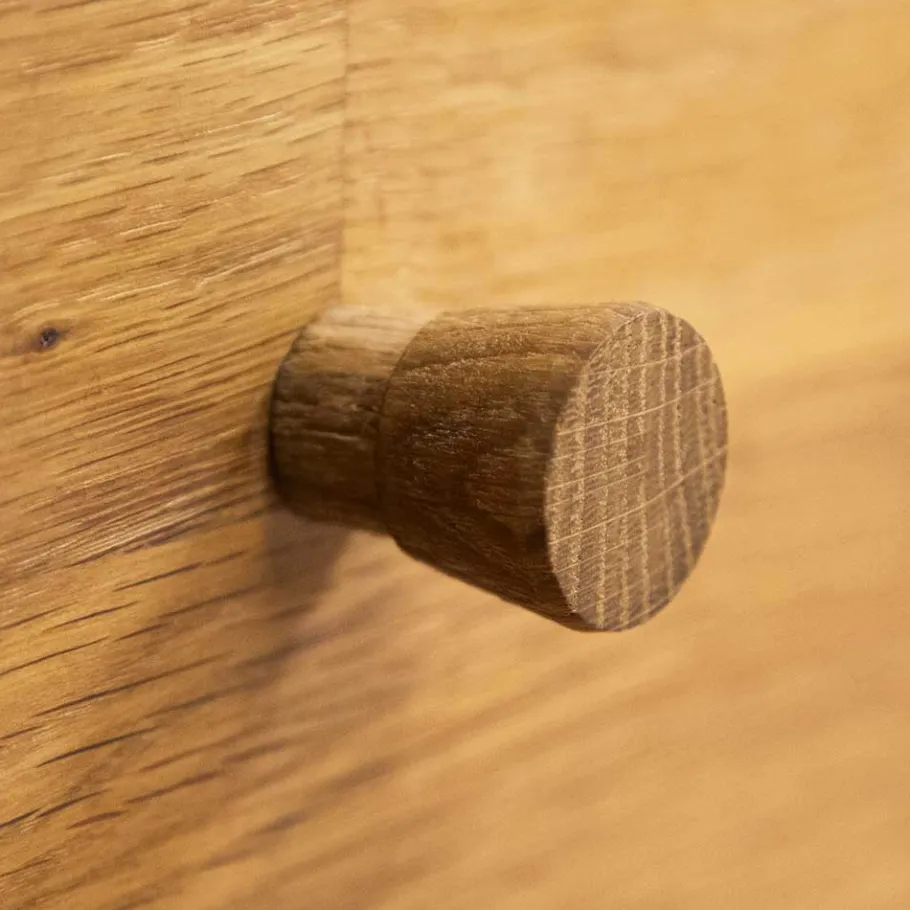 Die beiden Türen schließen dank integrierter Dämpfung leise und sanft. Hinter jeder Tür erwartet Sie ein Einlegeboden, der Ordnung leicht macht. Sechs Schubladen gleiten auf langlebigen Metallführungen und sind mit der Soft-Close-Funktion ausgestattet, sodass ein sanftes und leises Schließen jederzeit gewährleistet ist. Die dezente Eleganz der Knopfgriffe aus Holz rundet das Gesamtbild ab.