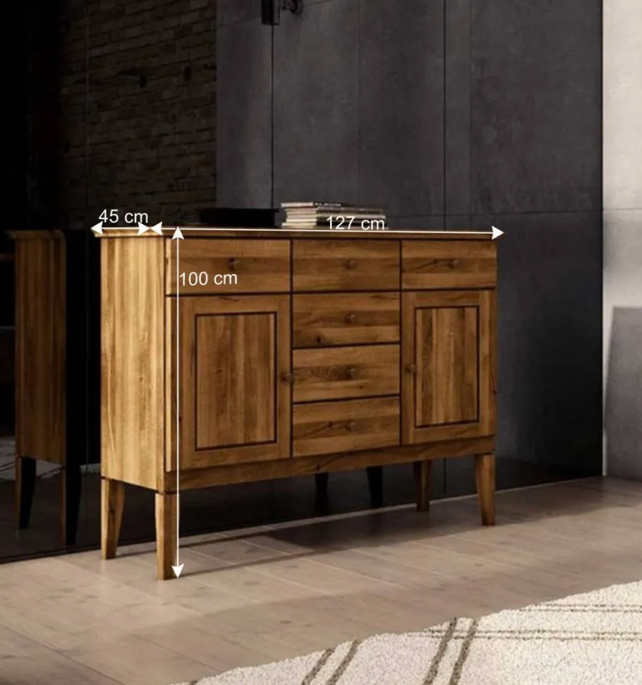 Mit Abmessungen von 127 cm Breite, 100 cm Höhe und 45 cm Tiefe kombiniert dieses Sideboard kompakte Eleganz mit funktionalem Stauraum. Es bietet Platz, um Ihre Welt in stilvollem Rahmen zu ordnen.