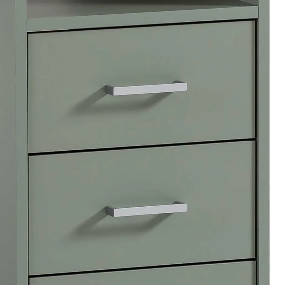 Die klare rechteckige Form und die moderne Oberfläche in Graugrün sorgen für einen frischen, zeitgemäßen Look, der sich harmonisch in unterschiedlichste Einrichtungsstile einfügt. Die melaminbeschichtete Oberfläche sieht nicht nur gut aus, sondern überzeugt auch mit praktischen Eigenschaften: Sie ist besonders pflegeleicht, kratzfest und resistent gegen Feuchtigkeit – ideal für den täglichen Einsatz.