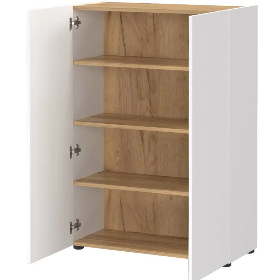 Die Schuhkommode bietet Platz für bis zu zwölf Paar Schuhe und überzeugt mit ihrer durchdachten Innenstruktur. Zwei Drehtüren mit robusten Metallscharnieren sorgen für einfache Handhabung, während drei verstellbare Einlegeböden eine flexible Anpassung ermöglichen. Die Kippsicherung gewährleistet Stabilität, und die belastbaren Ober- und Unterböden (jeweils 15 kg) sowie Einlegeböden (jeweils 5 kg) stehen für eine langlebige Nutzung. Die abgesenkte Deckplatte unterstreicht die elegante Optik.